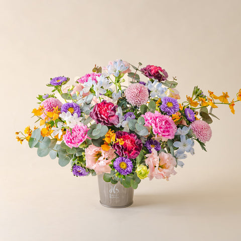 She makes it look easy (it's not—she's just brilliant). Aura celebrates the unsung heroines who hold everything together with quiet grace. This dreamy arrangement brings together purple and soft pink carnations, dancing yellow orchids, and delicate blue delphinium in a modern metallic grey pot that glows as beautifully as she does.