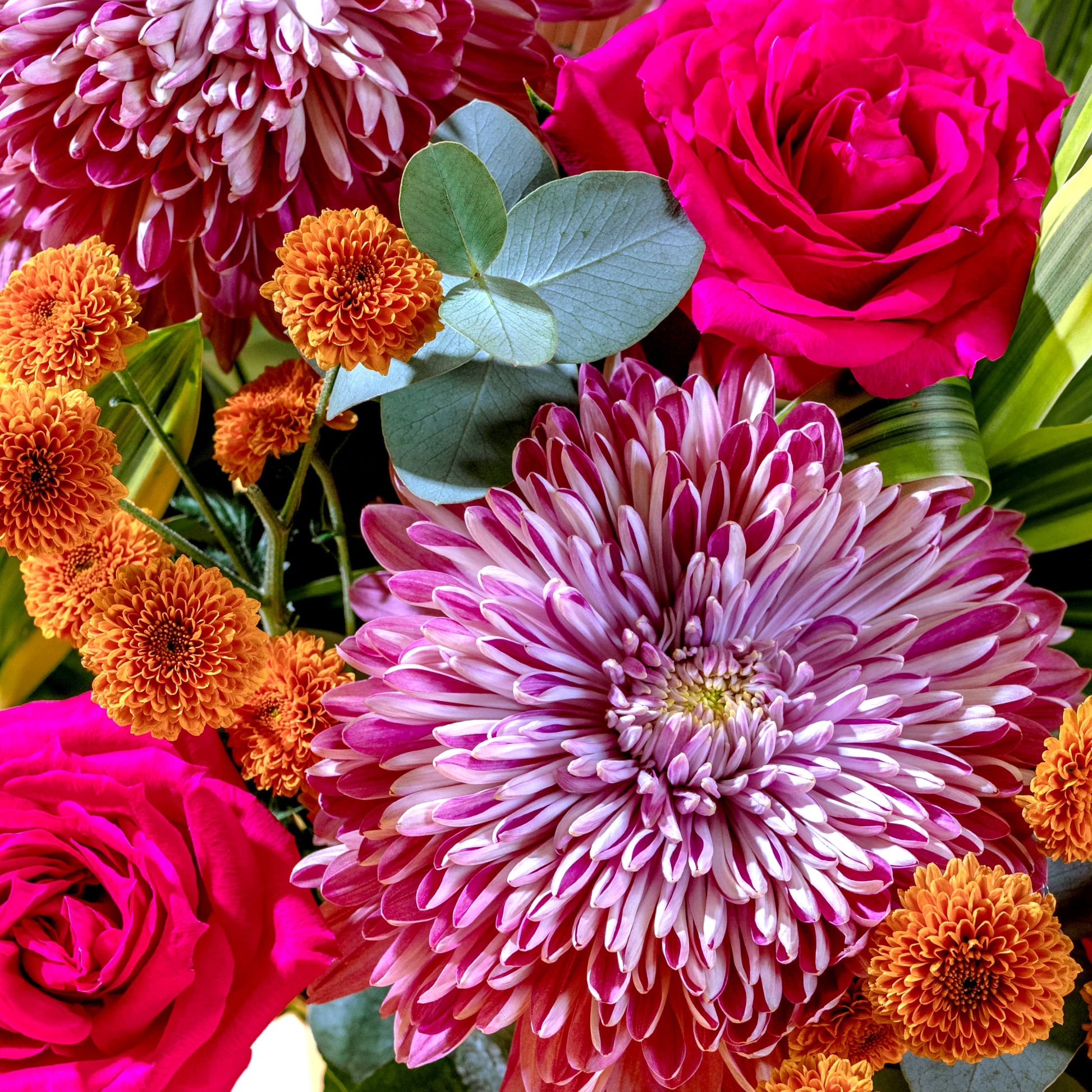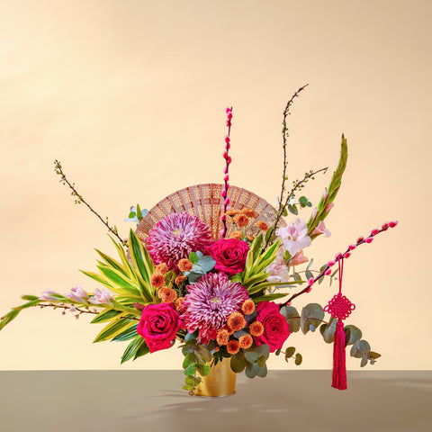 When hearts reunite under one roof, the moment deserves flowers as vibrant as the joy filling the room. Celebration brings together stunning shocking pink roses, lilac mums, champagne pom poms, and lucky pussy willows in a radiant gold pot adorned with a pink lucky tassel and elegant fan (prosperity never looked this beautiful).