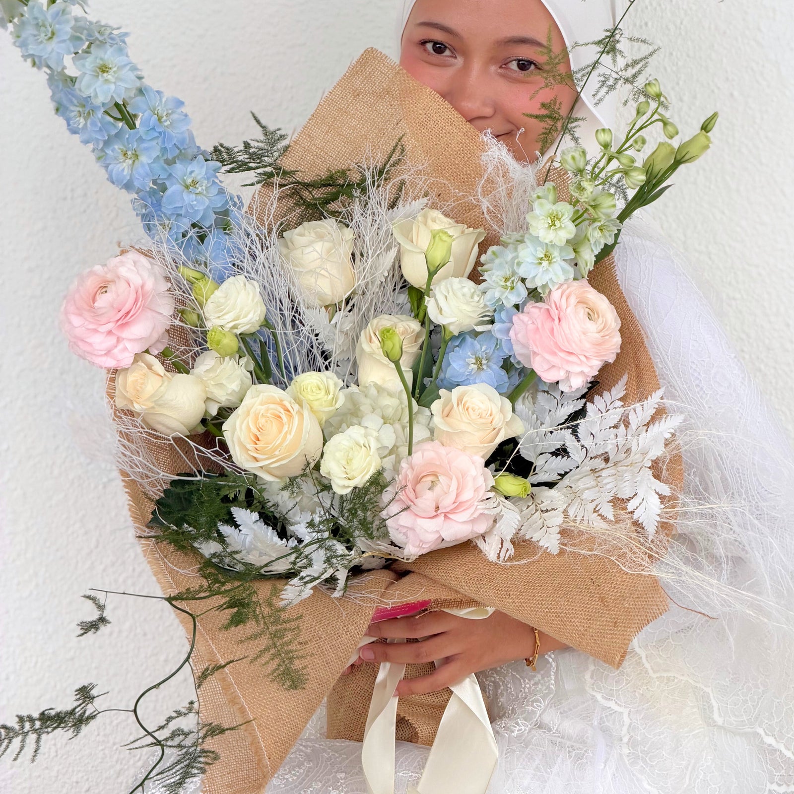 Dream is a stunning purplish bouquet with roses, Mathiolla, rose spray, eustoma, and Hana. Romantic and whimsical, this charming arrangement adds a touch of luxury to any occasion, perfect for expressing your sweetest feelings.