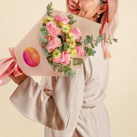 Delicate premium light pink roses set a romantic tone, paired with cheerful yellow pom pom rossi blooms and baby eucalyptus for a fresh, comforting finish. Light, warm, and full of heart, this arrangement captures the sweetness of love that doesn’t rush or shout, but stays steady and kind.