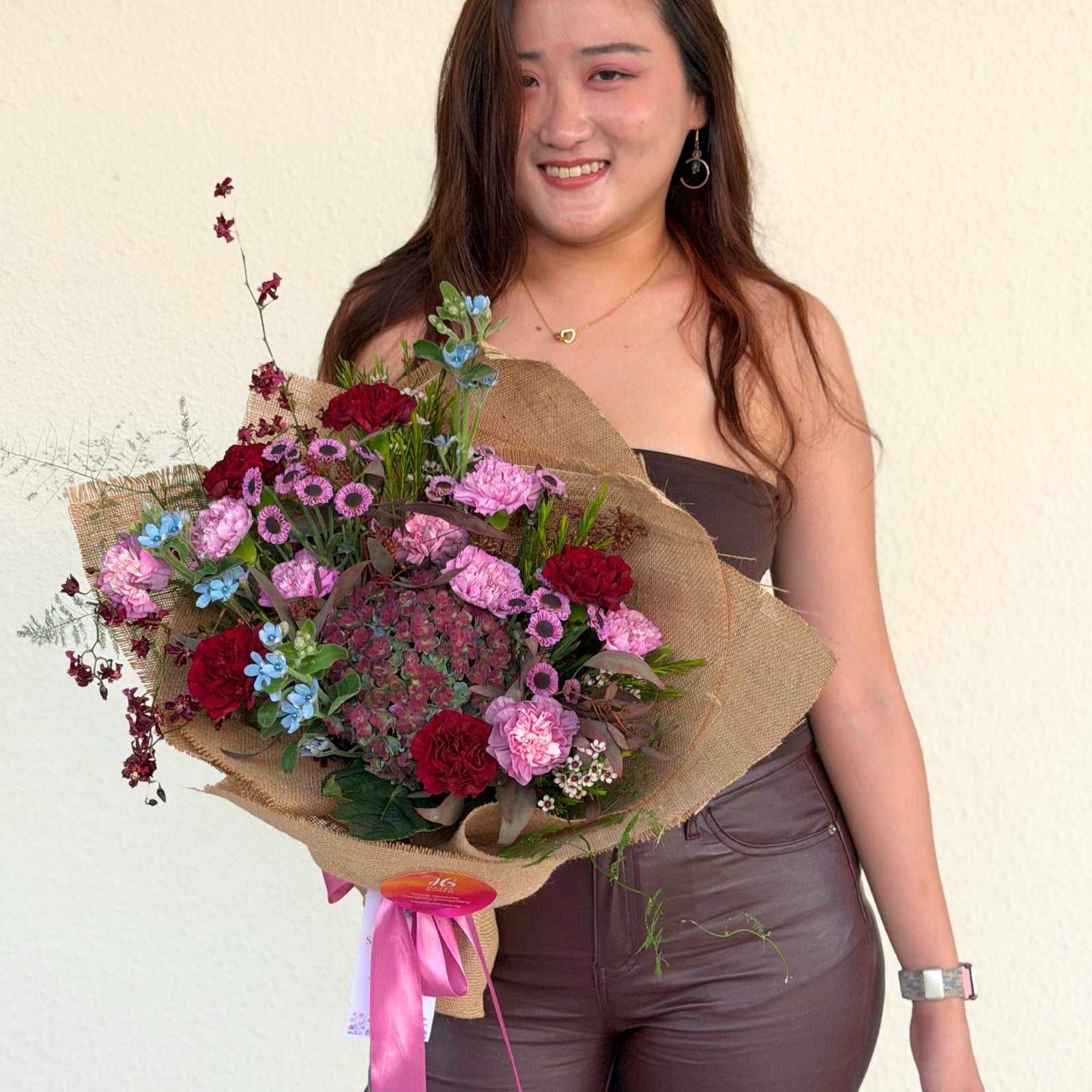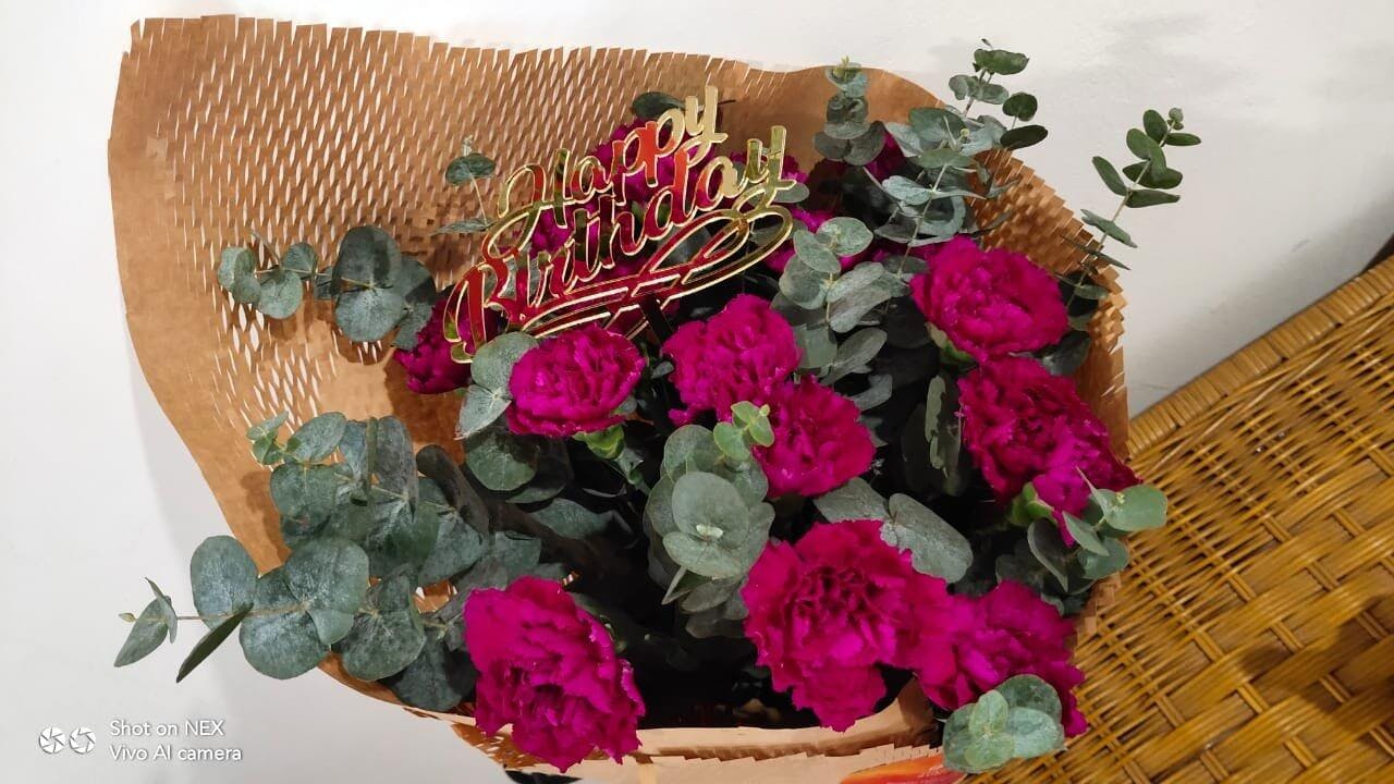 I ordered the purple carnations bouquet, it was perfect for the occasion and I was very touched by the care put into the flower arrangement and delivery service too. Thank you and I would definitely order again from Happy Bunch in the future